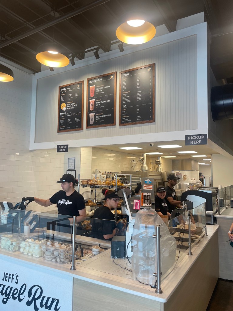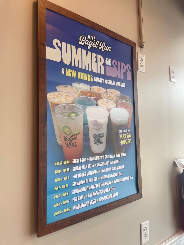 I was out and feeling hungry, so a bagel and coffee was just what I needed. Cue, Jeff’s! I was greeted immediately upon entering with a smile and welcome. I told my greeter it was my first time and got an explanation of the store. They bake all their bagels in house and package the smears separately to ensure freshness. It was also summer of sips which features two new drinks every other week.