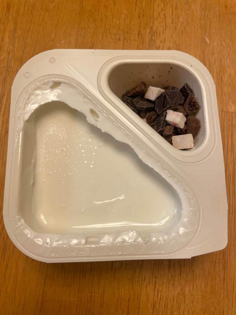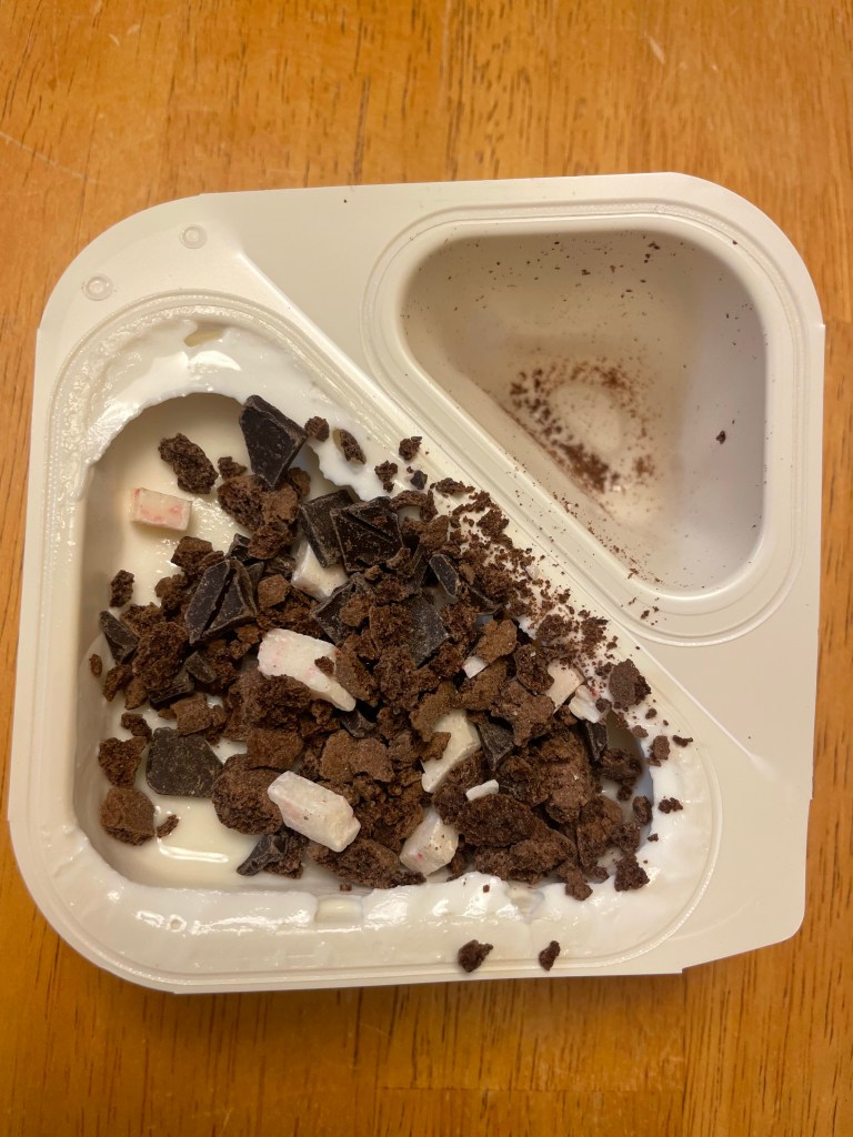 Opening it up you get two compartments. The yogurt and the toppings to mix in. This includes dark chocolate cookie crumbles, peppermint chunks, and dark chocolate chunks. Double trouble with that dark cocoa.