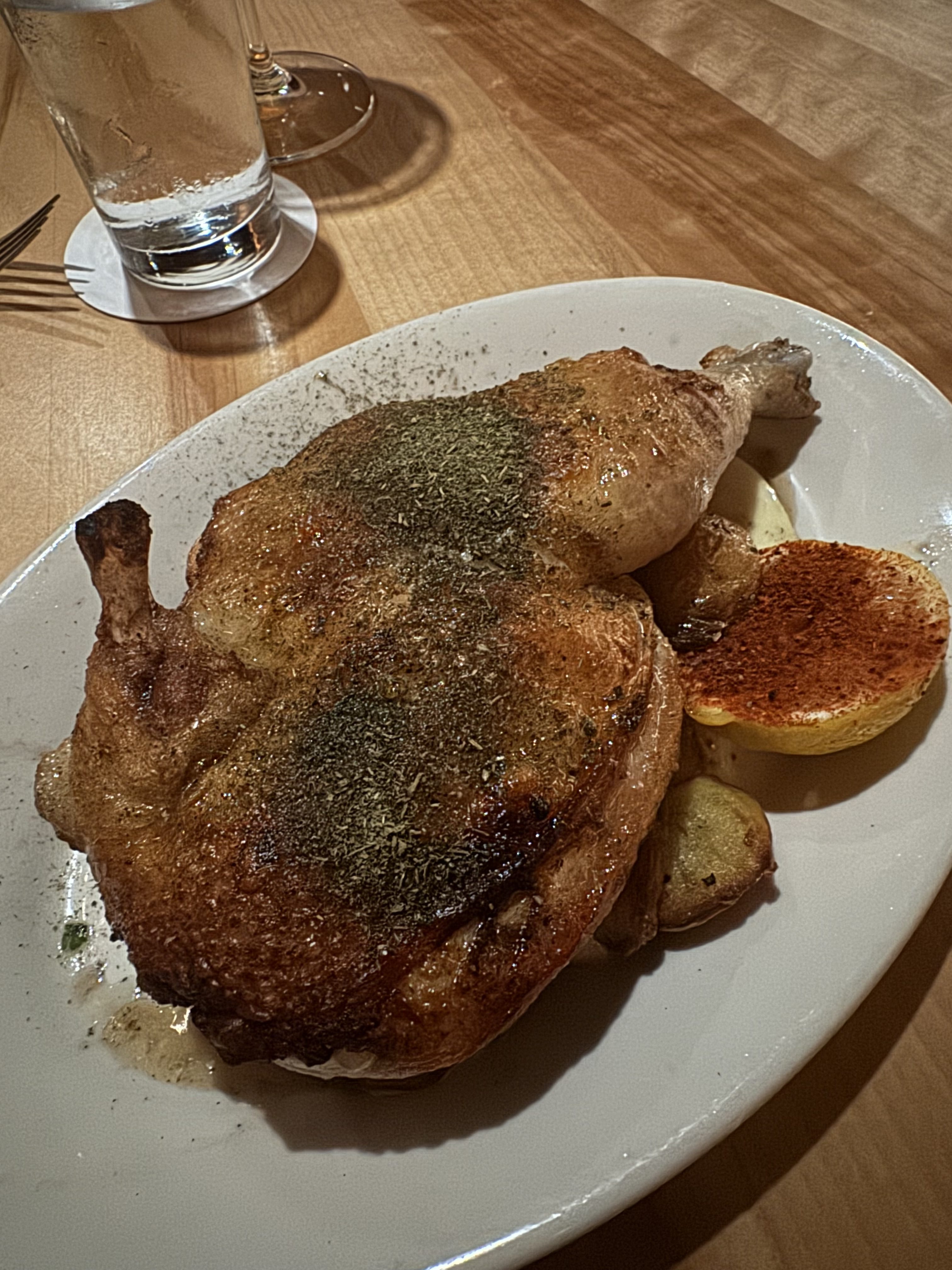 Finally it’s time for our main course. Our waiter said chicken was one of his favorites so we went with that. Chicken is always an interesting dish to order at a place like this because it’s a hard one to make shine. Theirs is a roast chicken with potatoes, lemon aioli, and herbed schmaltz. The technique and butchery of the chicken is impressive with absolutely no fatty parts, cartilage, or bones beside the main pieces. We squeezed the lemon and loved how it was covered in a spice blend that came out with the juice. The lemon aioli with the schmaltz was delicious and the meat was best when it’s soaking up that flavor. Otherwise, it tastes like a rotisserie chicken I’d get at a grocery store. The potatoes with the sauce were great and I gobbled those up.